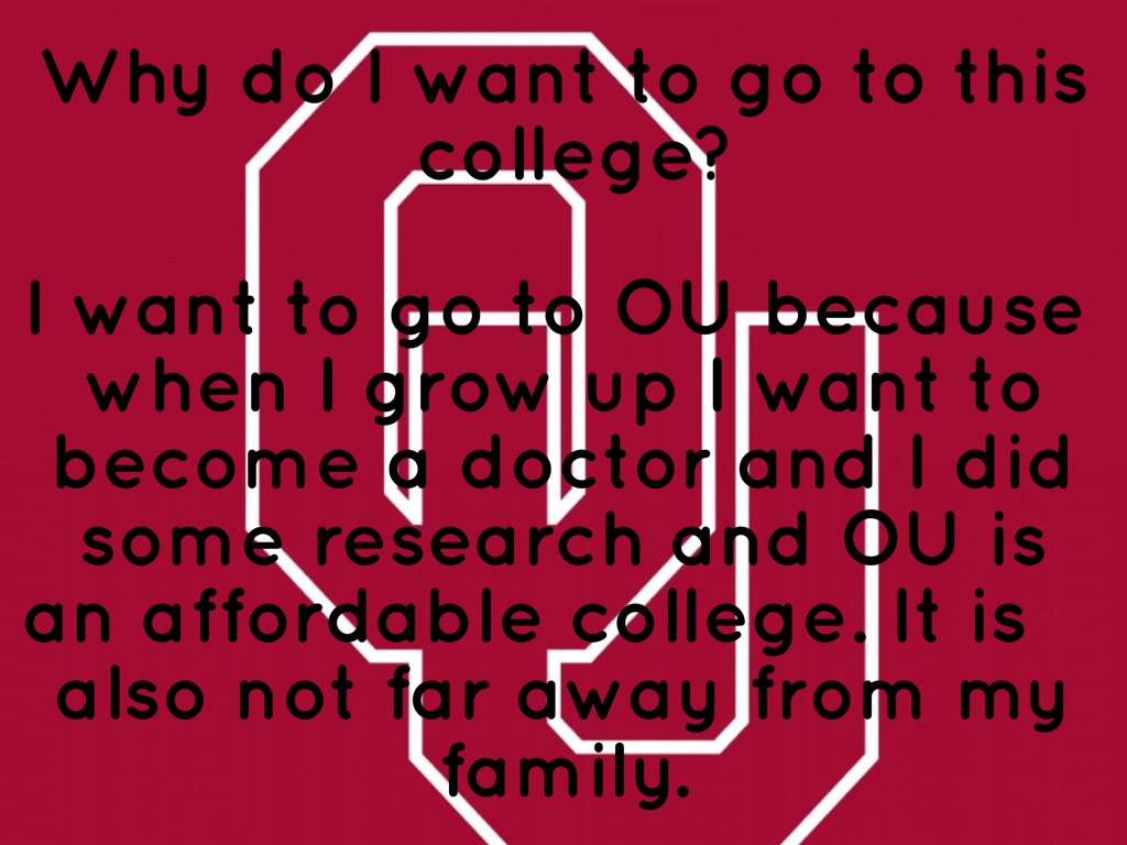 I want to go to OU because when I grow up I want to become a doctor and I did some research and OU is an affordable college. It is also not far away from my family.