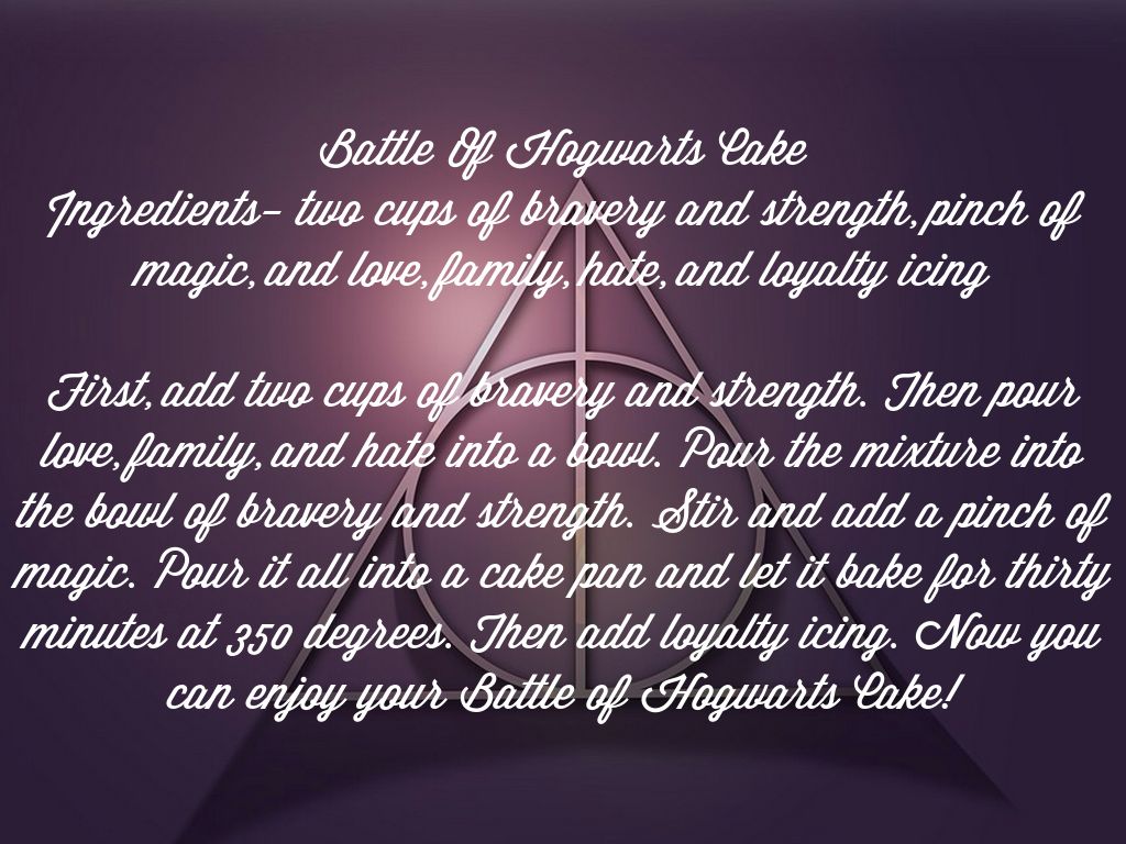 First, add two cups of bravery and strength. Then pour love, family, and hate into a bowl. Pour the mixture into the bowl of bravery and strength. Stir and add a pinch of magic. Pour it all into a cake pan and let it bake for thirty minutes at 350 degrees. Then add loyalty icing. Now you can enjoy your Battle of Hogwarts Cake!