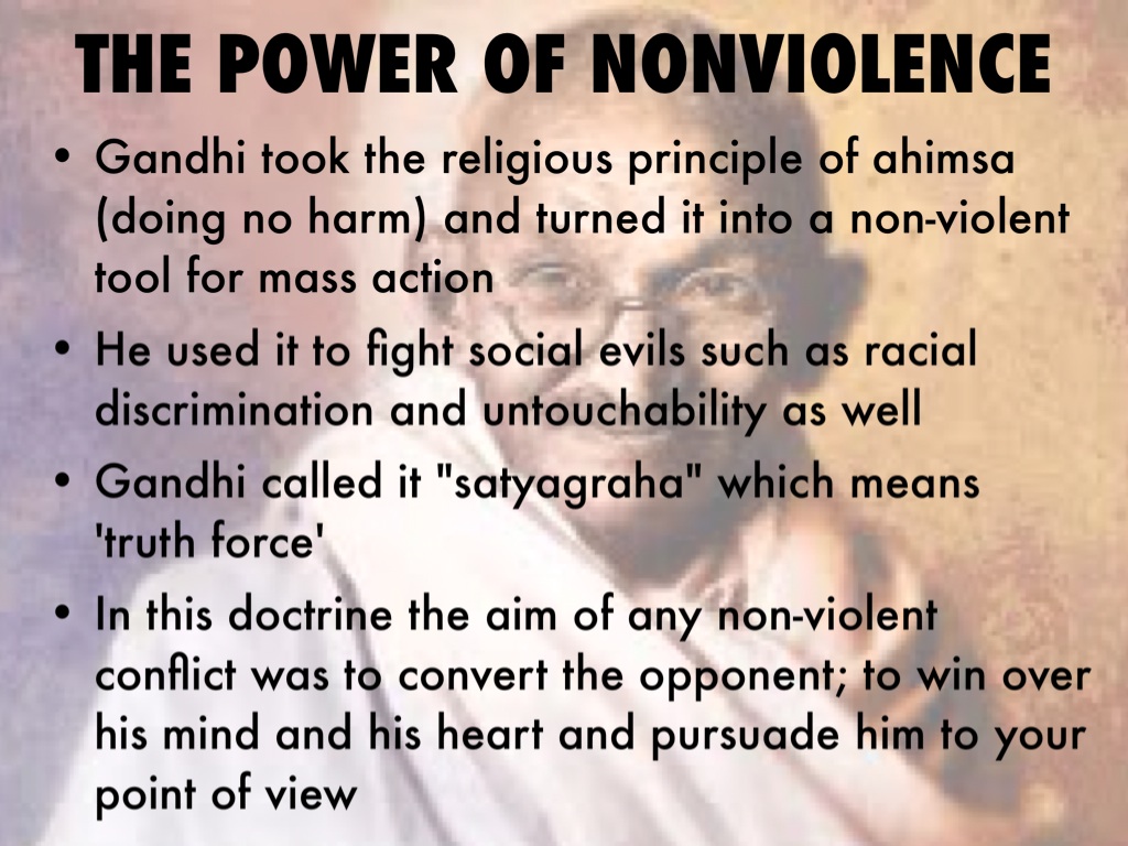 • Gandhi took the religious principle of ahimsa (doing no harm) and turned it into a non-violent tool for mass action