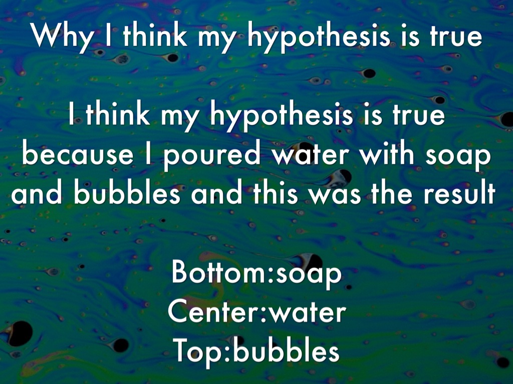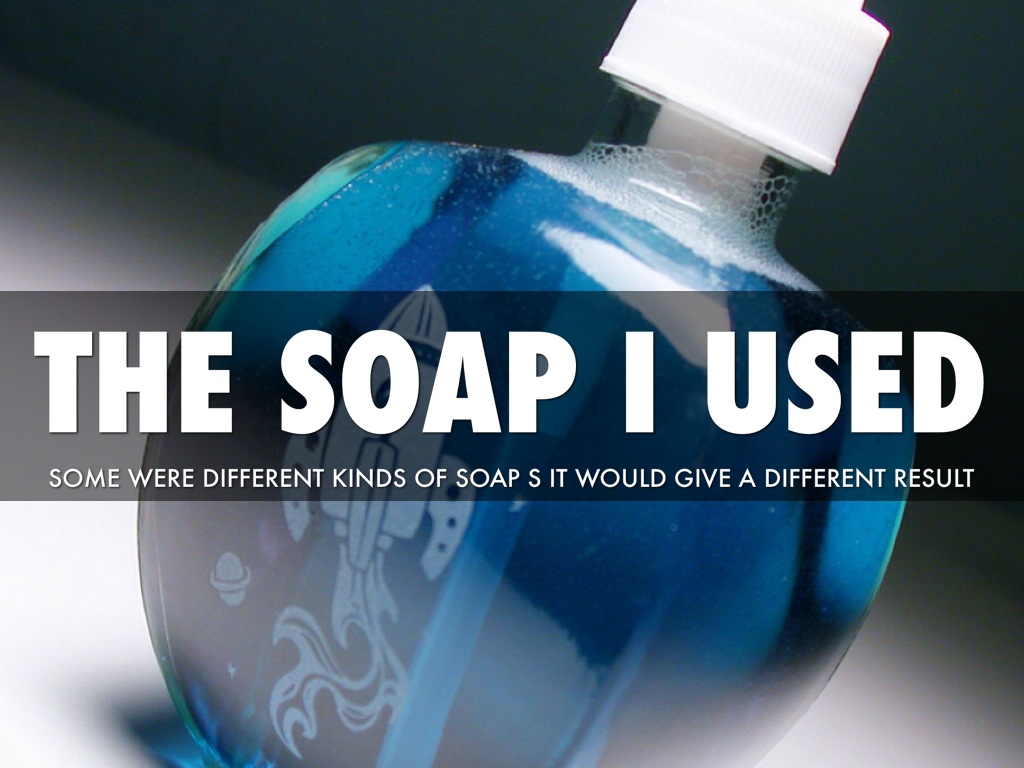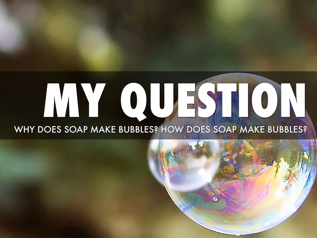 My results were that bubbles are created by soap because the soap is a kind of chemical that doesn't harm us but does lots of things.I also Think that (but I am not so sure about this one) the water takes away the weight in the soap and when we rub it with force it spreads out and turns into bubbles.