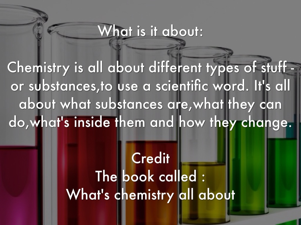 Chemistry is all about different types of stuff -or substances,to use a scientific word. It's all about what substances are,what they can do,what's inside them and how they change.
