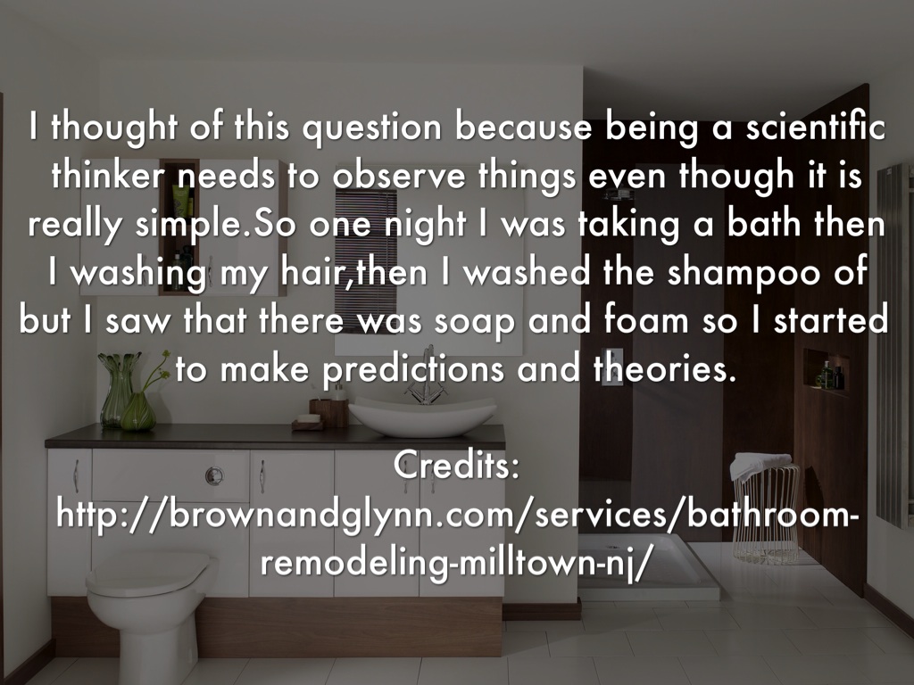 I thought of this question because being a scientific thinker needs to observe things even though it is really simple.So one night I was taking a bath then I washing my hair,then I washed the shampoo of but I saw that there was soap and foam so I started to make predictions and theories.