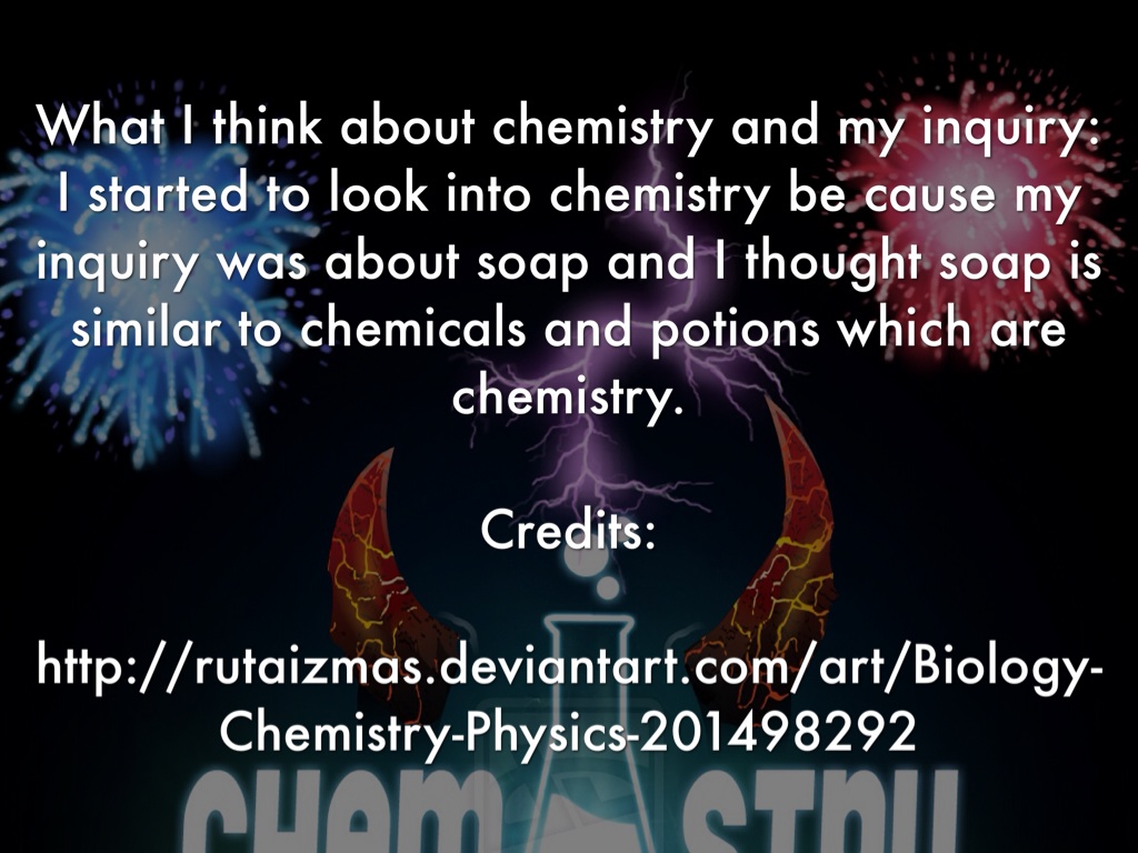 What I think about chemistry and my inquiry: I started to look into chemistry be cause my inquiry was about soap and I thought soap is similar to chemicals and potions which are chemistry.