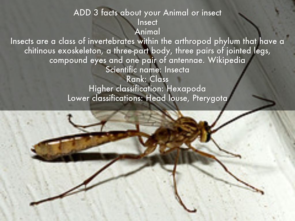 ADD 3 facts about your Animal or insect Insect Animal Insects are a class of invertebrates within the arthropod phylum that have a chitinous exoskeleton, a three-part body, three pairs of jointed legs, compound eyes and one pair of antennae. Wikipedia Scientific name: Insecta Rank: Class Higher classification: Hexapoda Lower classifications: Head louse, Pterygota