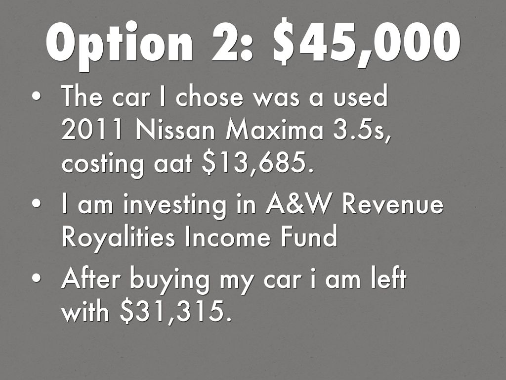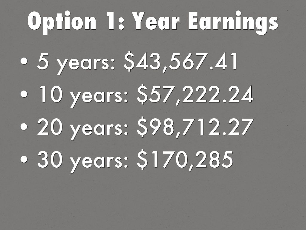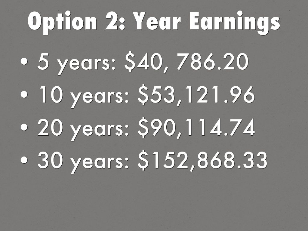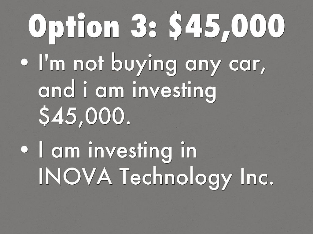 I would chose option 3 because in 30 years, i would have earned more money than the other options. I would also invest more money because I wouldn't have spent money on a car. Lastly, i wouldn't have to pay a 10,000 dollar loan back.