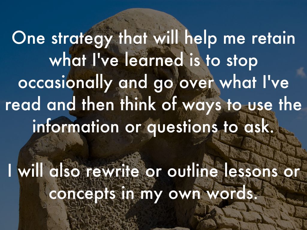 One strategy that will help me retain what I've learned is to stop occasionally and go over what I've read and then think of ways to use the information or questions to ask.