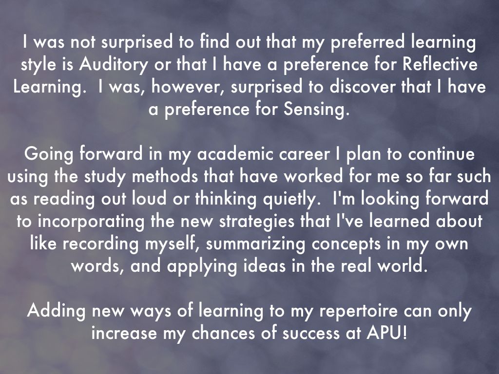 I was not surprised to find out that my preferred learning style is Auditory or that I have a preference for Reflective Learning. I was, however, surprised to discover that I have a preference for Sensing.