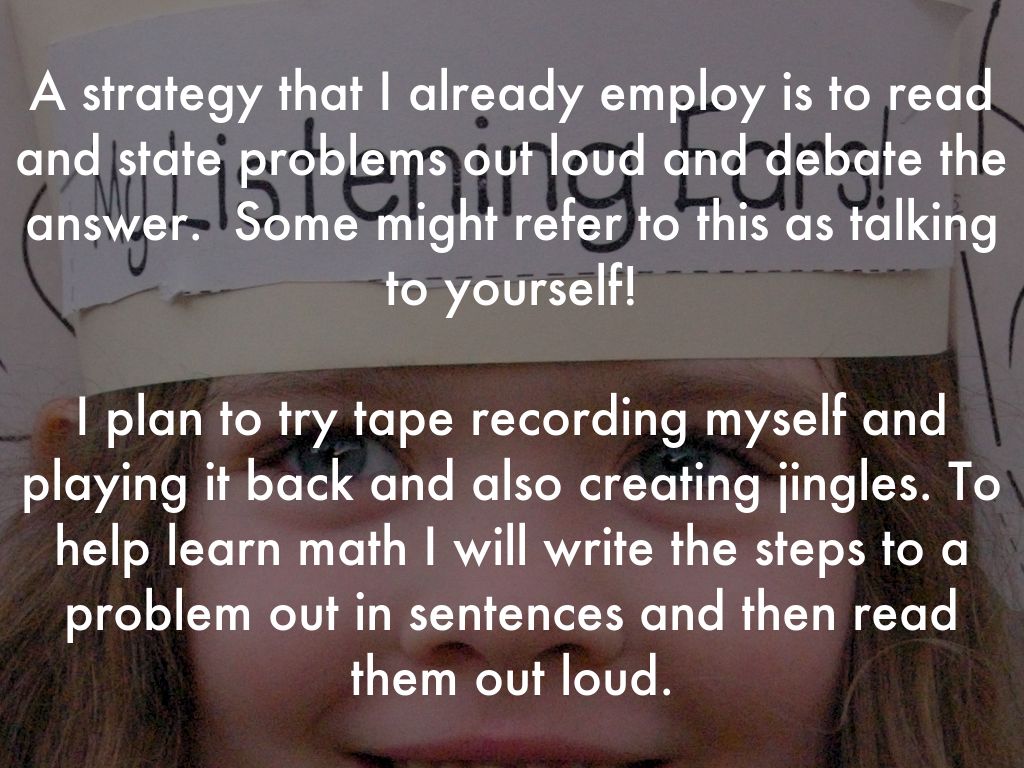 I plan to try tape recording myself and playing it back and also creating jingles. To help learn math I will write the steps to a problem out in sentences and then read them out loud.