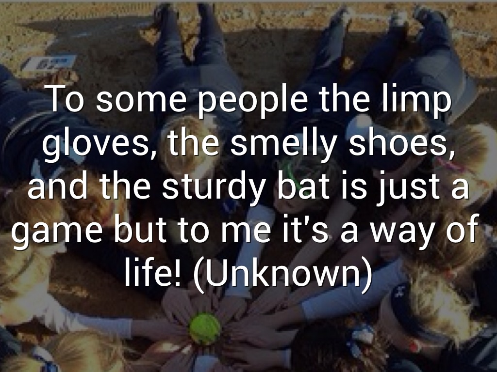 To some people the limp gloves, the smelly shoes, and the sturdy bat is just a game but to me it's a way of life! (Unknown)