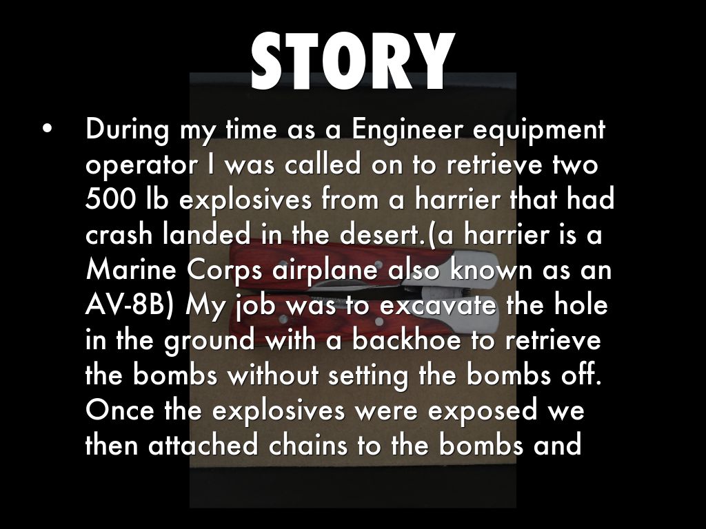 During my time as a Engineer equipment operator I was called on to retrieve two 500 lb explosives from a harrier that had crash landed in the desert.(a harrier is a Marine Corps airplane also known as an AV-8B) My job was to excavate the hole in the ground with a backhoe to retrieve the bombs without setting the bombs off. Once the explosives were exposed we then attached chains to the bombs and carefully lifted them from the ground.