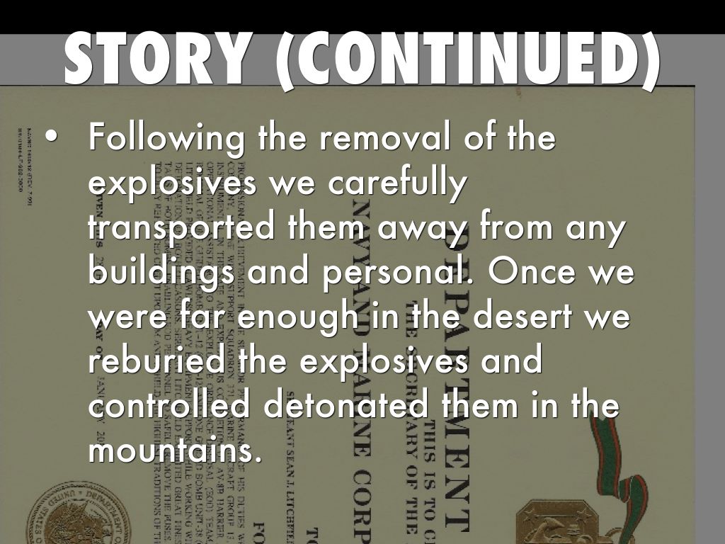 Following the removal of the explosives we carefully transported them away from any buildings and personal. Once we were far enough in the desert we reburied the explosives and controlled detonated them in the mountains.