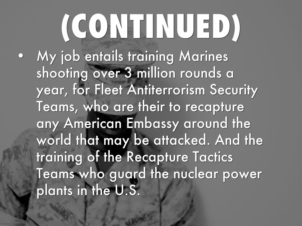 My job entails training Marines shooting over 3 million rounds a year, for Fleet Antiterrorism Security Teams, who are their to recapture any American Embassy around the world that may be attacked. And the training of the Recapture Tactics Teams who guard the nuclear power plants in the U.S.