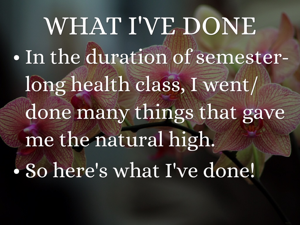 • In the duration of semester- long health class, I went/done many things that gave me the natural high.