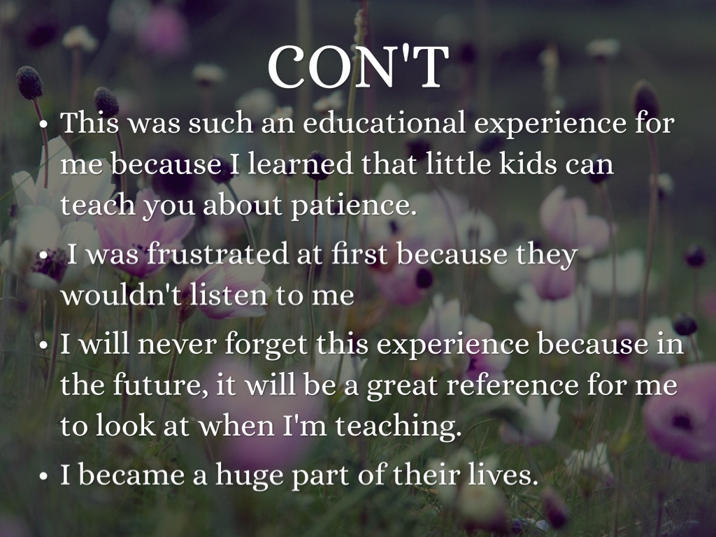 • This was such an educational experience for me because I learned that little kids can teach you about patience.