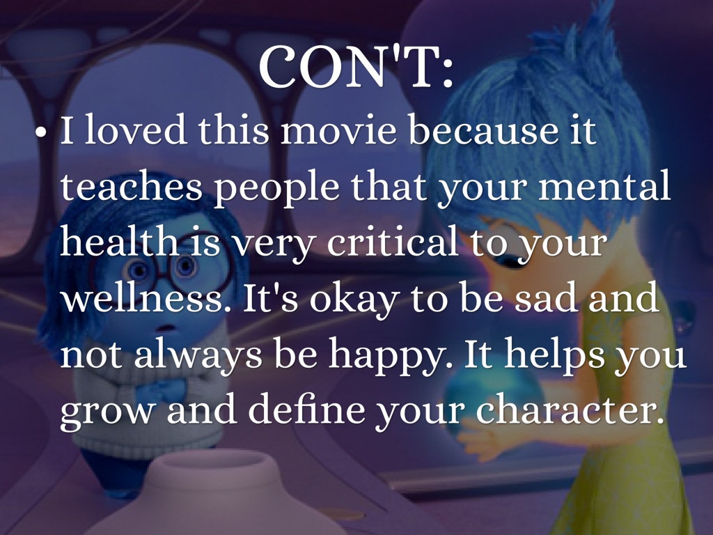 • I loved this movie because it teaches people that your mental health is very critical to your wellness. It's okay to be sad and not always be happy. It helps you grow and define your character.