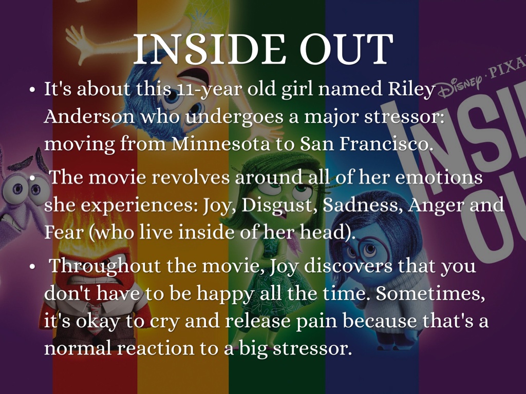 - Throughout the movie, Joy discovers that you don't have to be happy all the time. Sometimes, it's okay to cry and release pain because that's a normal reaction to a big stressor.
