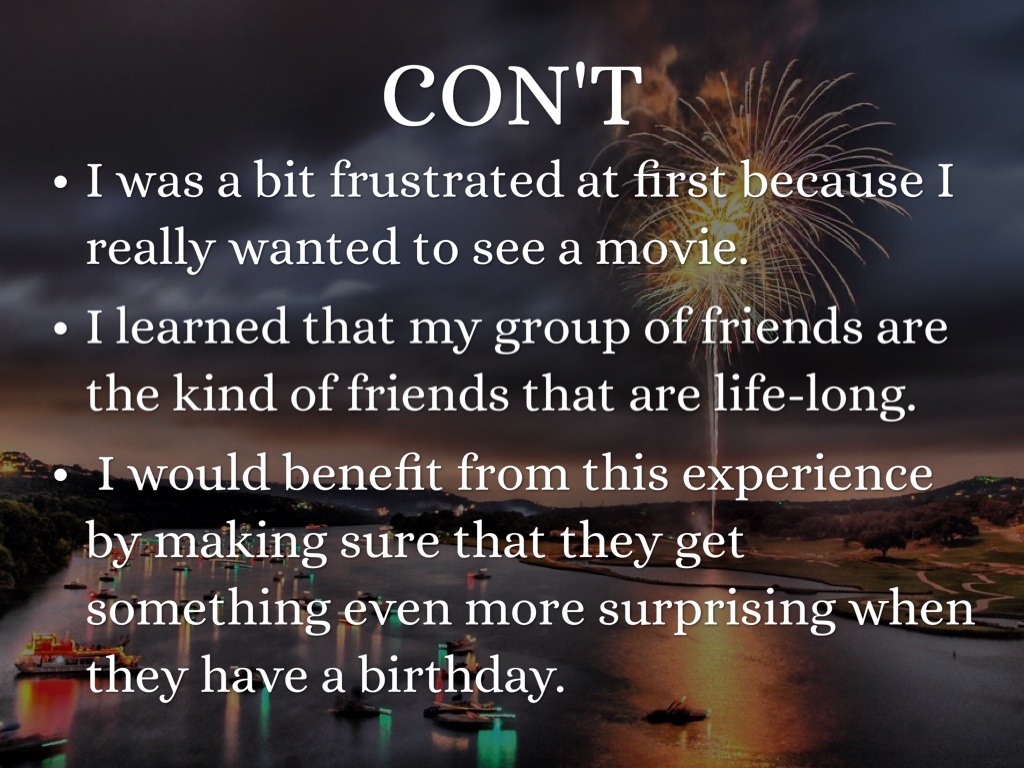 • I would benefit from this experience by making sure that they get something even more surprising when they have a birthday.