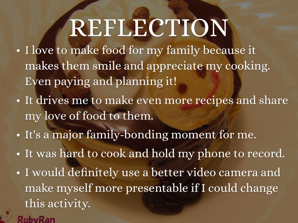 • I love to make food for my family because it makes them smile and appreciate my cooking. Even paying and planning it!