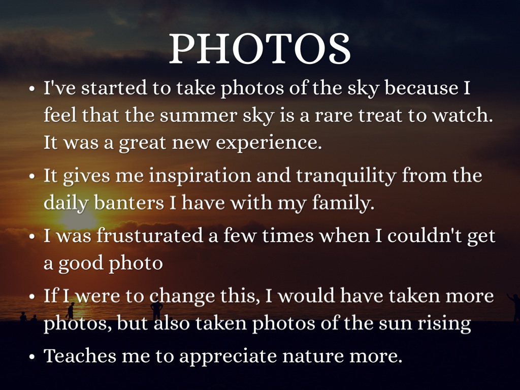 - I've started to take photos of the sky because I feel that the summer sky is a rare treat to watch. It was a great new experience.