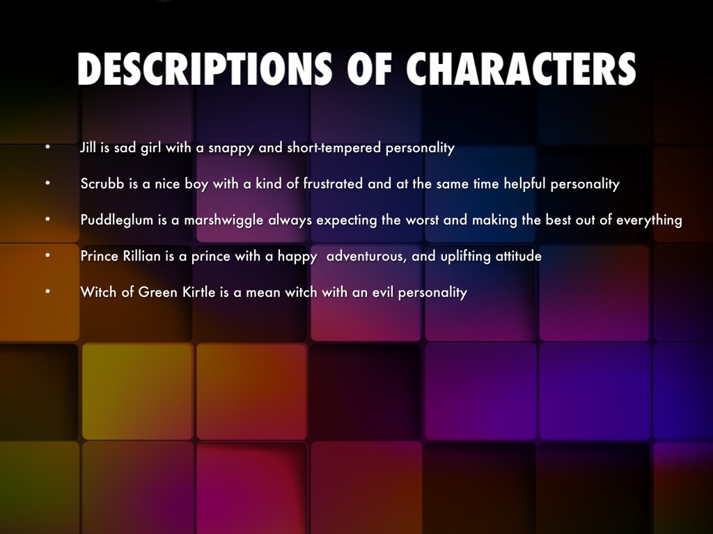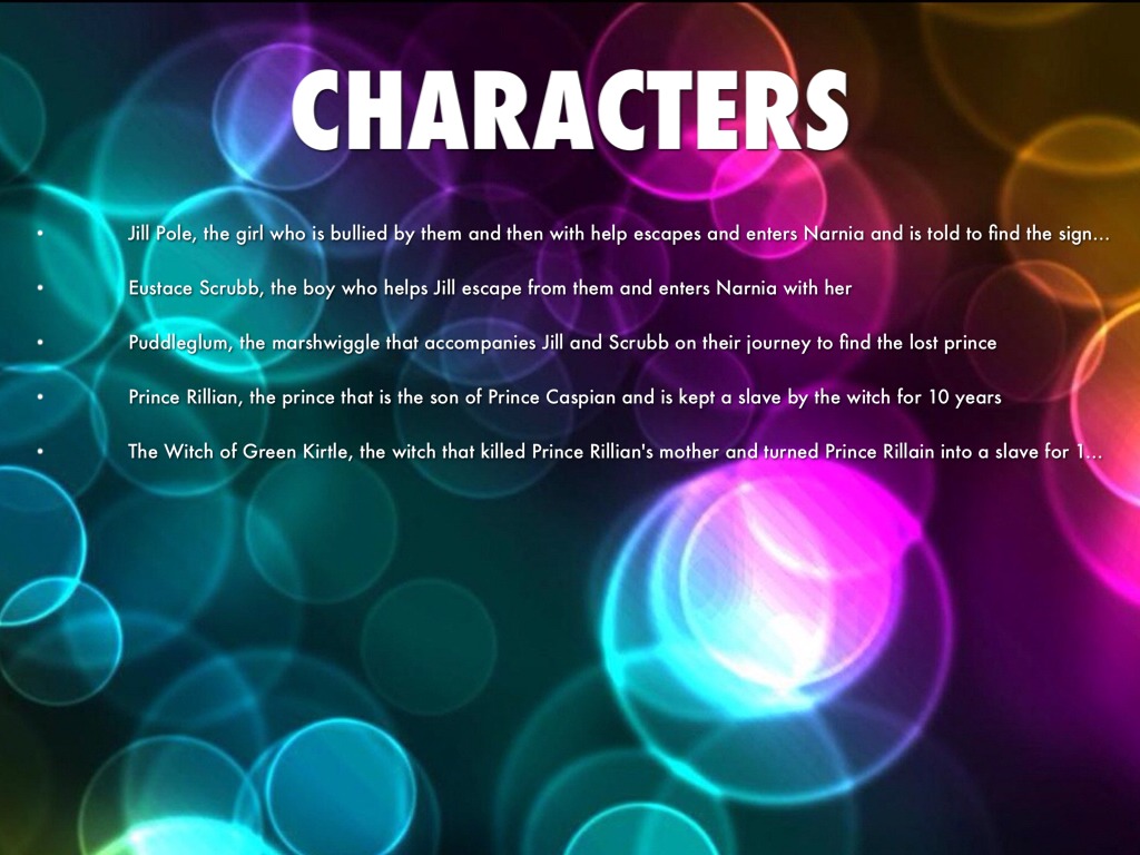 - Jill Pole, the girl who is bullied by them and then with help escapes and enters Narnia and is told to find the signs of Prince Rillian