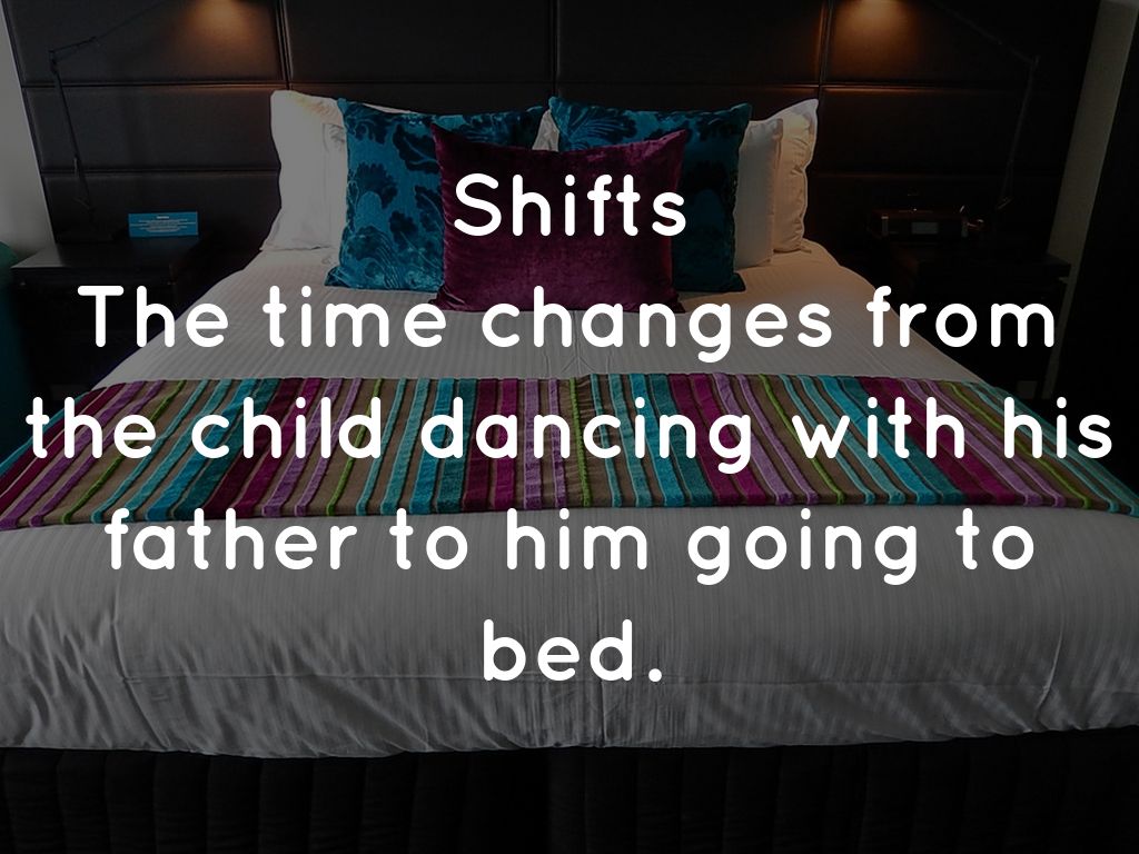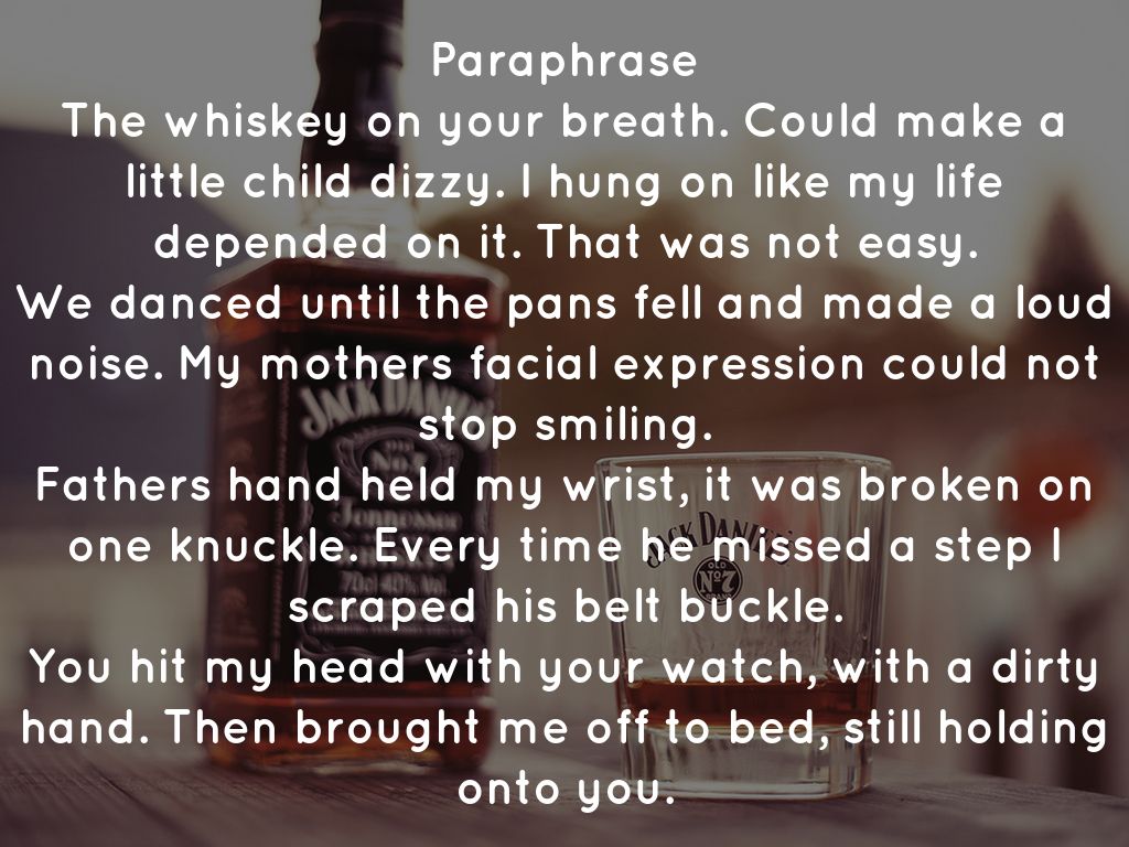 Paraphrase The whiskey on your breath. Could make a little child dizzy. I hung on like my life depended on it. That was not easy. We danced until the pans fell and made a loud noise. My mothers facial expression could not stop smiling. Fathers hand held my wrist, it was broken on one knuckle. Every time he missed a step I scraped his belt buckle. You hit my head with your watch, with a dirty hand. Then brought me off to bed, still holding onto you.