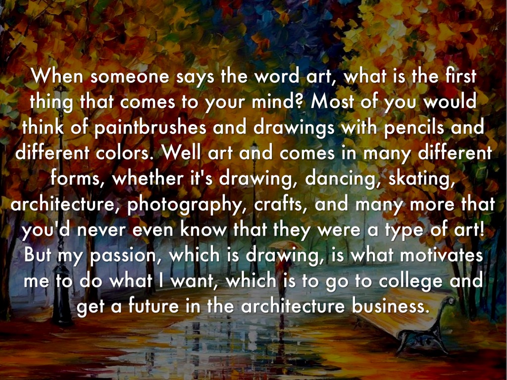 When someone says the word art, what is the first thing that comes to your mind? Most of you would think of paintbrushes and drawings with pencils and different colors. Well art and comes in many different forms, whether it's drawing, dancing, skating, architecture, photography, crafts, and many more that you'd never even know that they were a type of art! But my passion, which is drawing, is what motivates me to do what I want, which is to go to college and get a future in the architecture business.