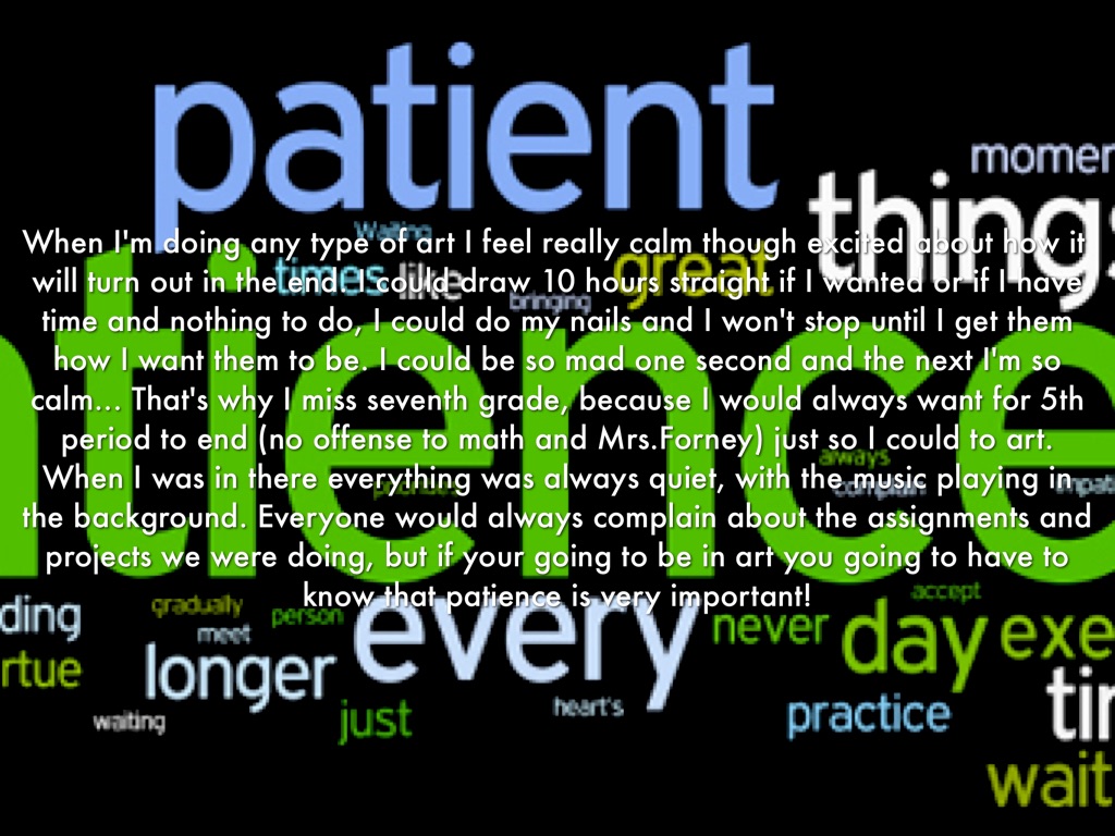 When I'm doing any type of art I feel really calm though excited about how it will turn out in the end. I could draw 10 hours straight if I wanted or if I have time and nothing to do, I could do my nails and I won't stop until I get them how I want them to be. I could be so mad one second and the next I'm so calm... That's why I miss seventh grade, because I would always want for 5th period to end (no offense to math and Mrs.Forney) just so I could to art. When I was in there everything was always quiet, with the music playing in the background. Everyone would always complain about the assignments and projects we were doing, but if your going to be in art you going to have to know that patience is very important!
