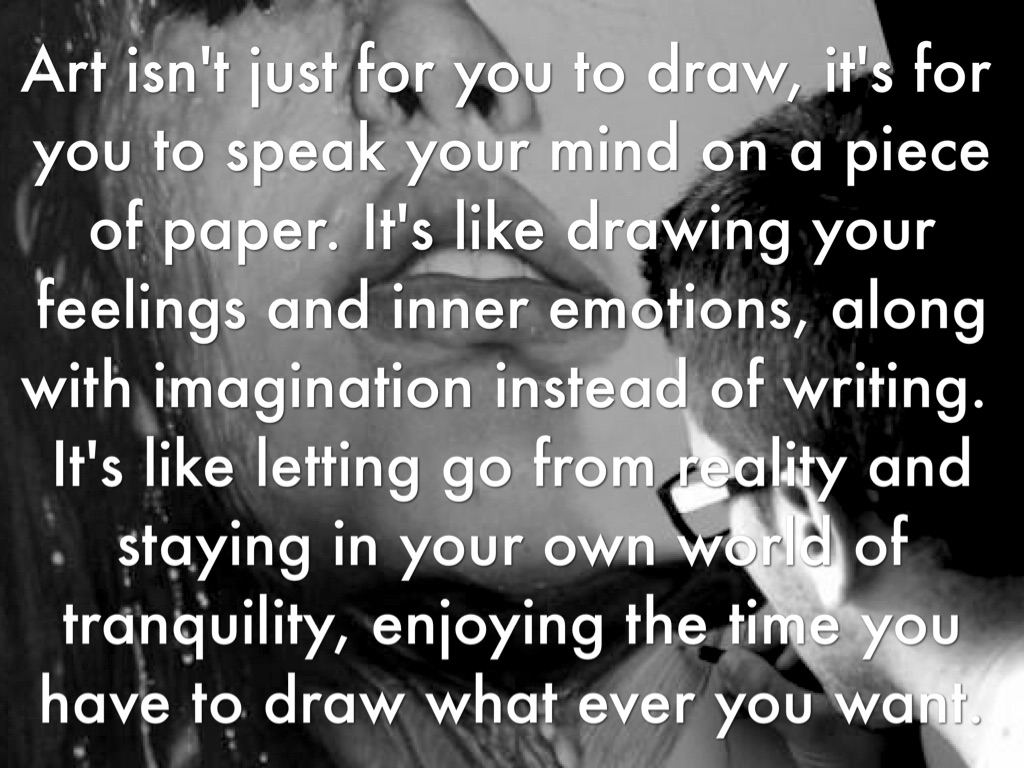 Art isn't just for you to draw, it's for you to speak your mind on a piece of paper. It's like drawing your feelings and inner emotions, along with imagination instead of writing. It's like letting go from reality and staying in your own world of tranquility, enjoying the time you have to draw what ever you want.