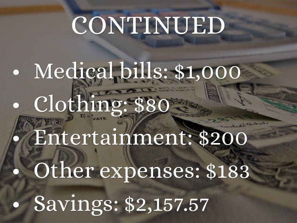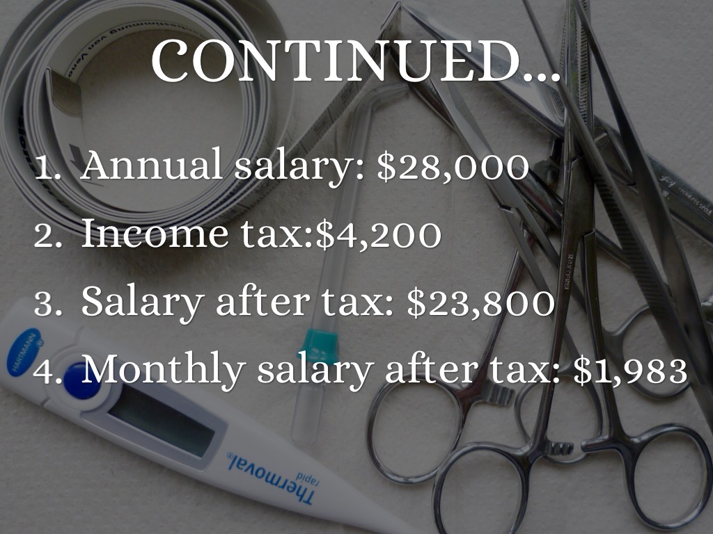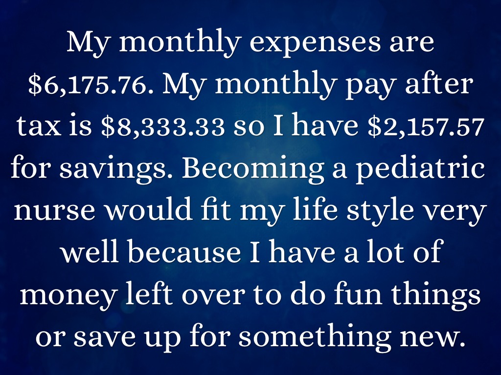 My monthly expenses are $6,175.76. My monthly pay after tax is $8,333.33 so I have $2,157.57 for savings. Becoming a pediatric nurse would fit my life style very well because I have a lot of money left over to do fun things or save up for something new.