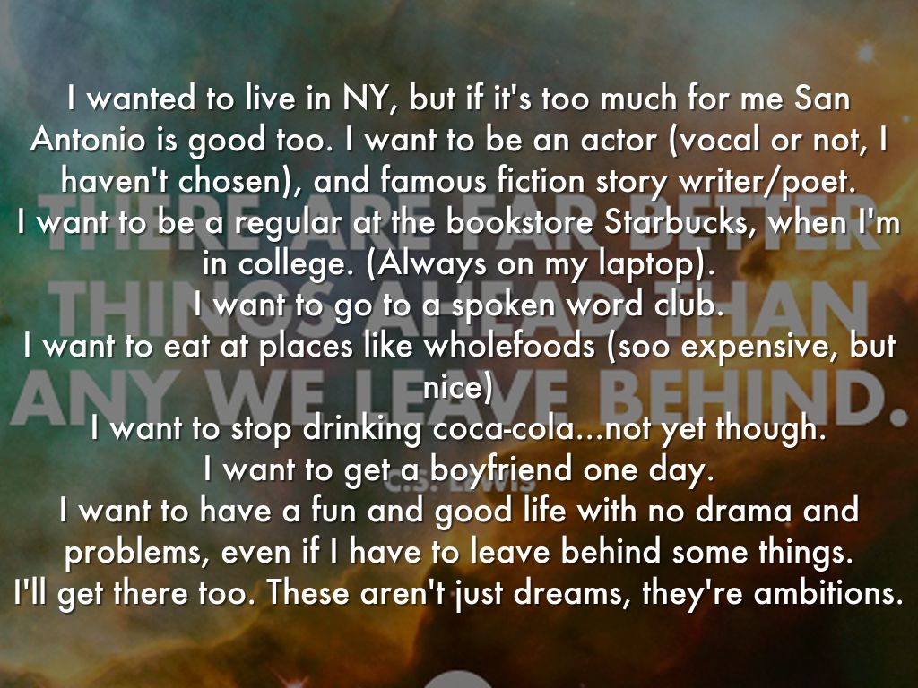 I wanted to live in NY, but if it's too much for me San Antonio is good too. I want to be an actor (vocal or not, I haven't chosen), and famous fiction story writer/poet.