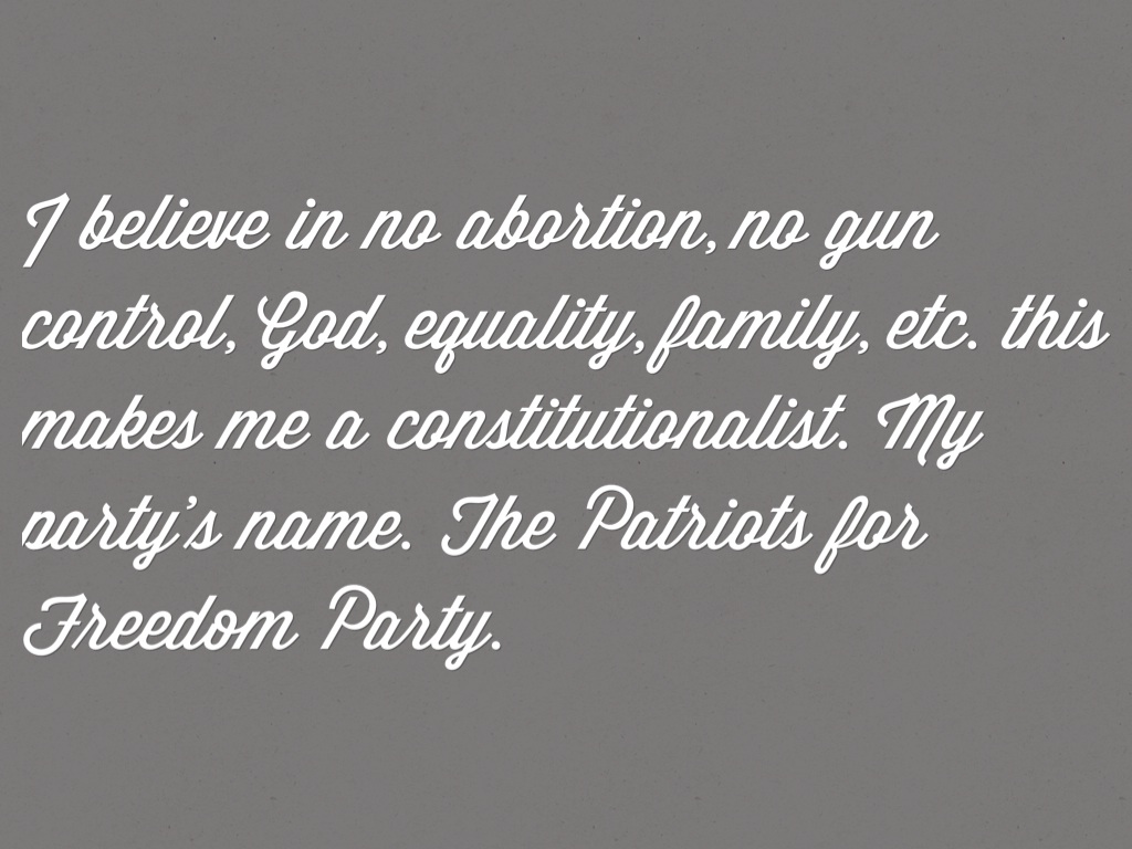 I believe in no abortion, no gun control, God, equality, family, etc. this makes me a constitutionalist. My party's name. The Patriots for Freedom Party.
