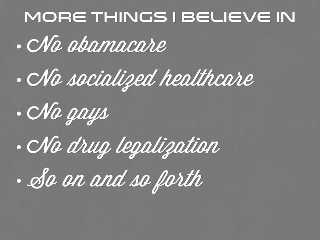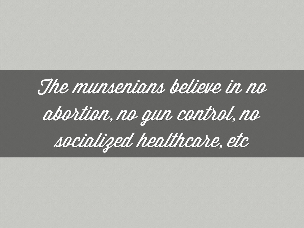 The munsenians believe in no abortion, no gun control, no socialized healthcare, etc