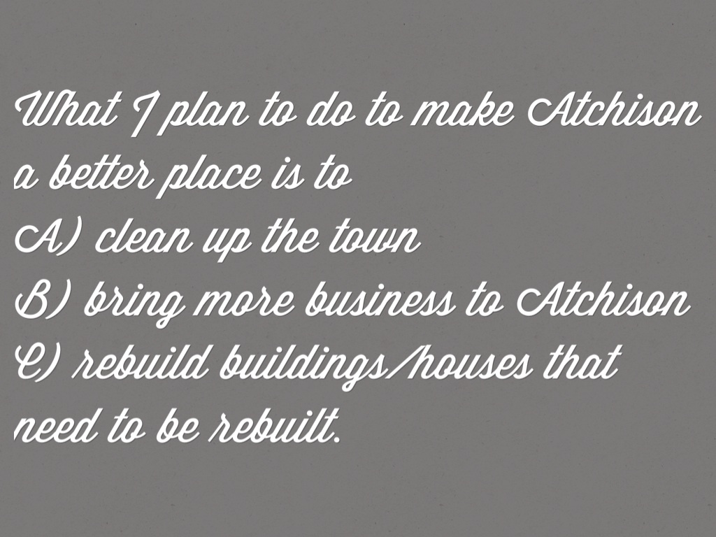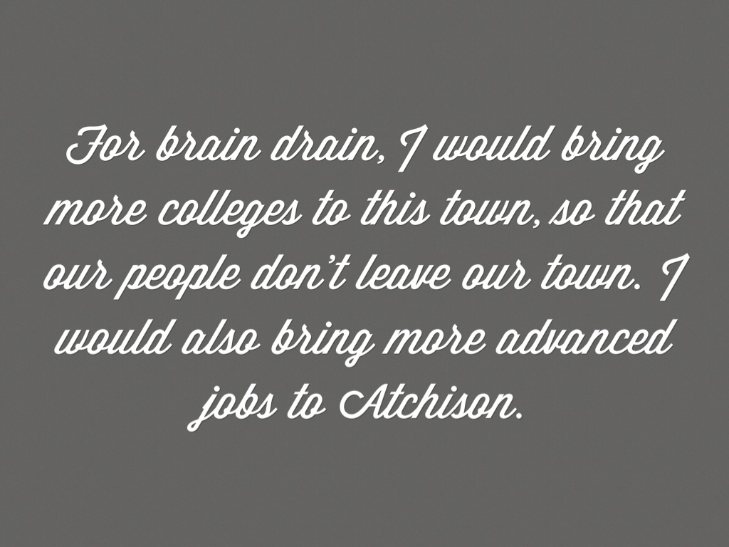 For brain drain, I would bring more colleges to this town, so that our people don't leave our town. I would also bring more advanced jobs to Atchison.