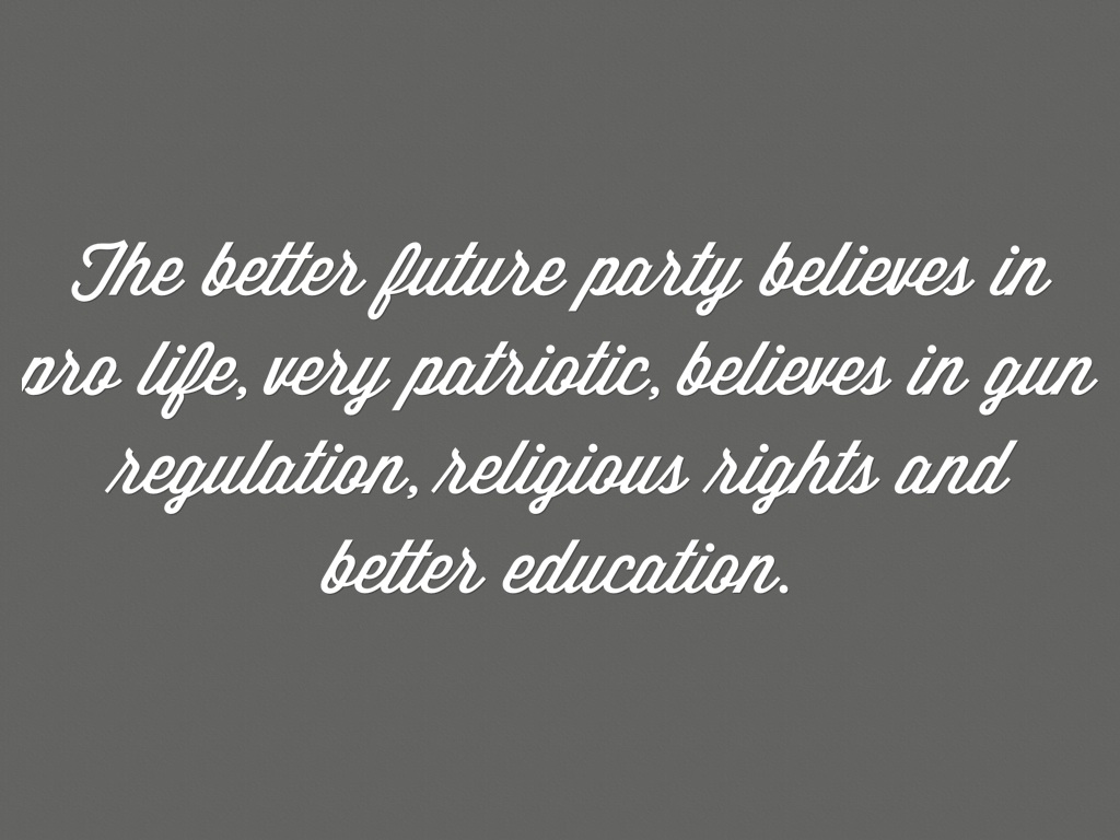 The better future party believes in pro life, very patriotic, believes in gun regulation, religious rights and better education.
