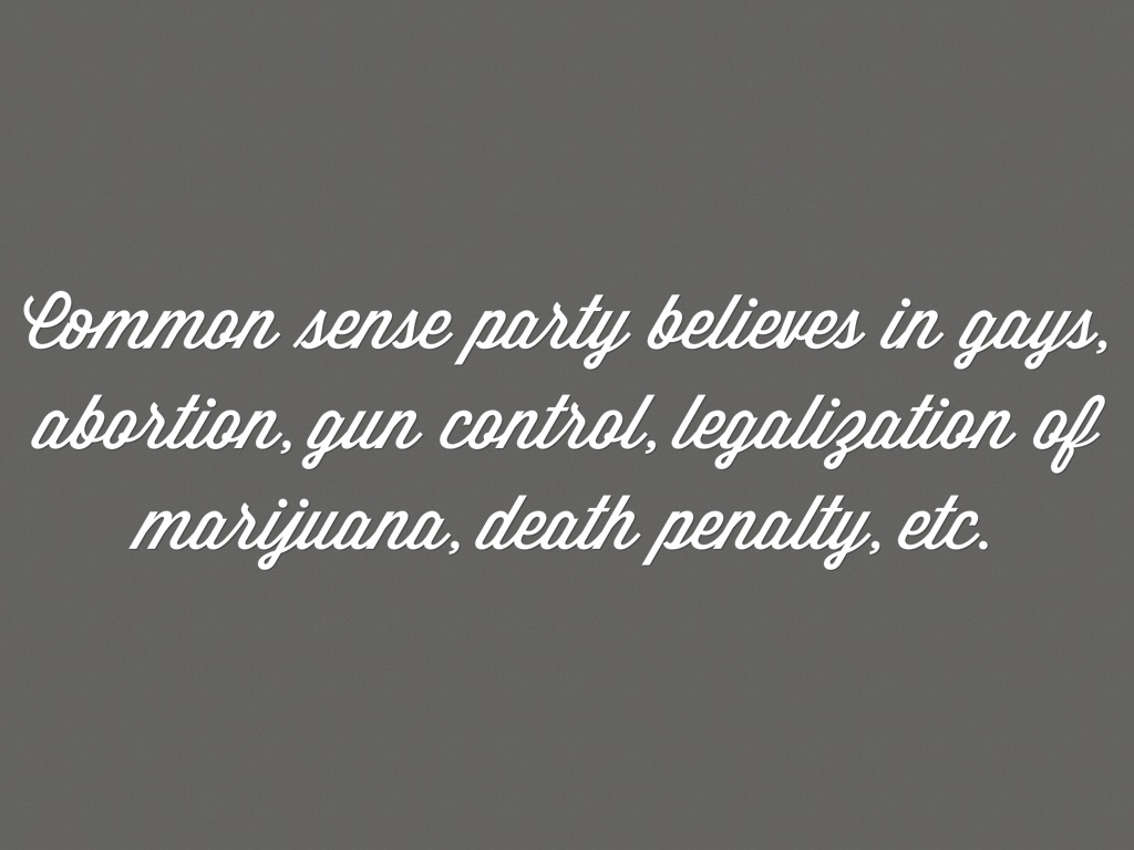 Common sense party believes in gays, abortion, gun control, legalization of marijuana, death penalty, etc.