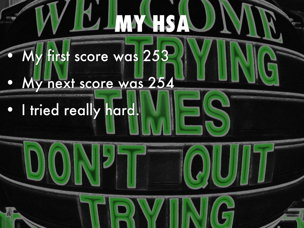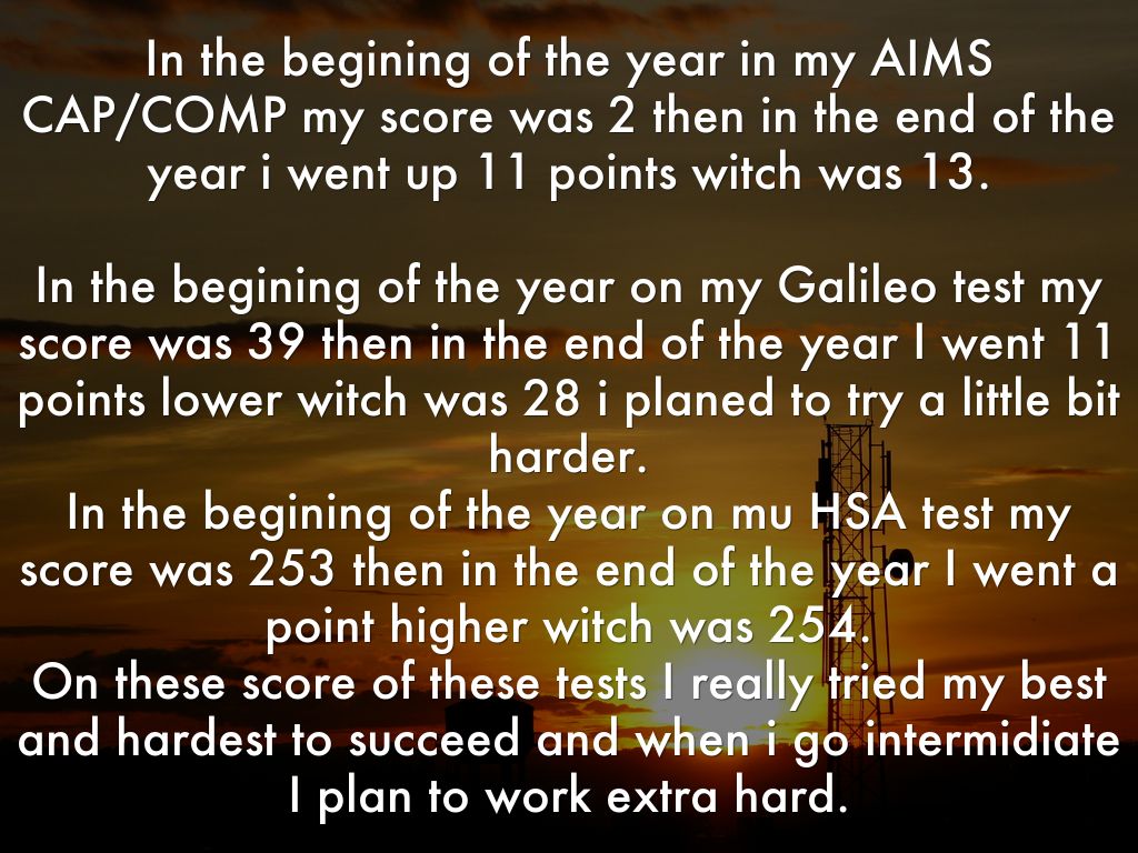 In the begining of the year on my Galileo test my score was 39 then in the end of the year I went 11 points lower witch was 28 i planed to try a little bit harder. In the begining of the year on mu HSA test my score was 253 then in the end of the year I went a point higher witch was 254. On these score of these tests I really tried my best and hardest to succeed and when i go intermidiate I plan to work extra hard.