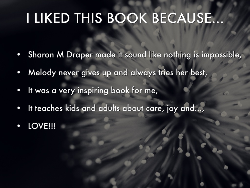 Best Parts Of The Book The best parts of the book are probably when Melody got her medi-talker so that she can speak. It made a real improvement on her life! Another one of the best parts was when Melody was on the quiz team and got perfect score on her tests! It makes me feel inspired!