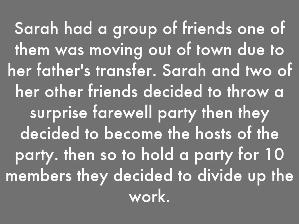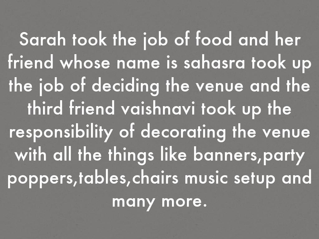 Sarah took the job of food and her friend whose name is sahasra took up the job of deciding the venue and the third friend vaishnavi took up the responsibility of decorating the venue with all the things like banners,party poppers,tables,chairs music setup and many more.