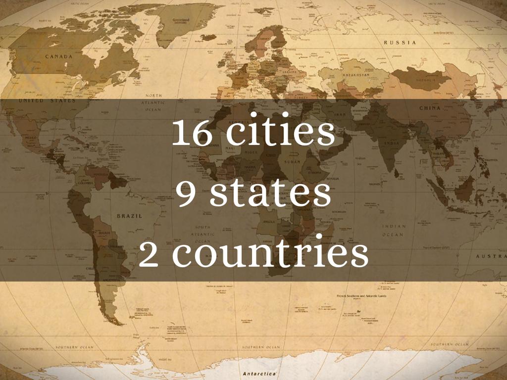 but i was raised in 5 cities (madurai, tindivanam, pondicherry, calcutta, karaikudi) and lived in 11 cities (jaipur, hyderabad, chennai, plainville, wichita, sunnyvale, milpitas, bellevue, sammamish, saratoga, cupertino), spanning across 9 states (TN / WB / RJ / AP ; VA / CT / KS / CA / WA) and 2 countries.