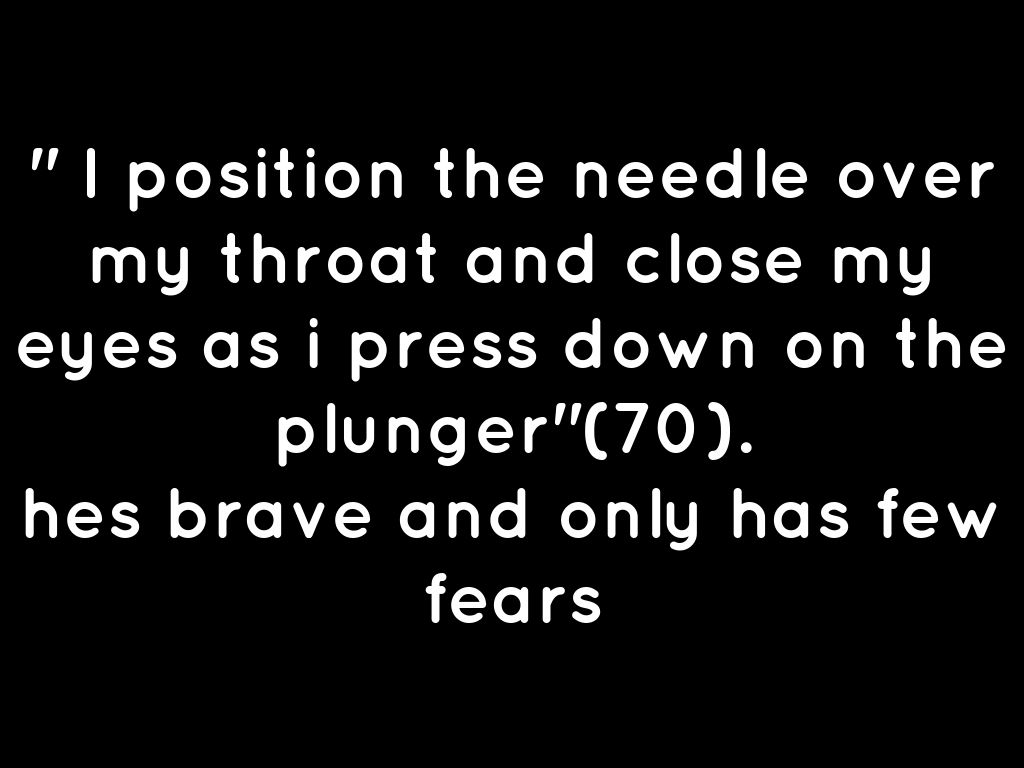 " I position the needle over my throat and close my eyes as i press down on the plunger"(70).
