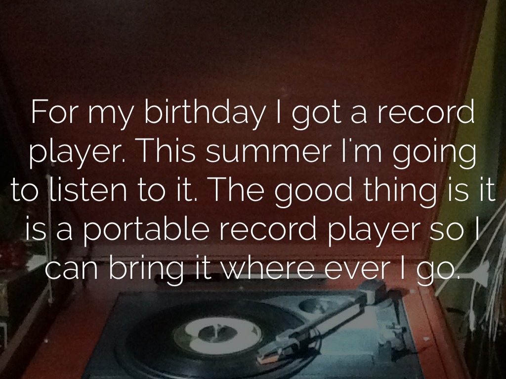 For my birthday I got a record player. This summer I'm going to listen to it. The good thing is it is a portable record player so I can bring it where ever I go.