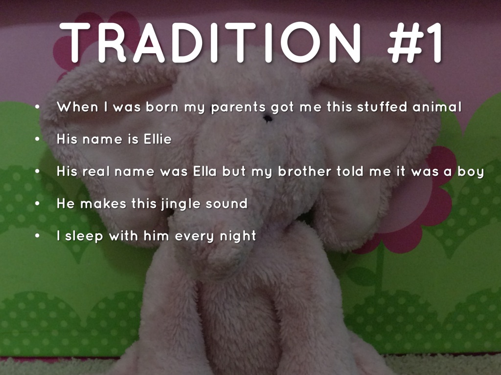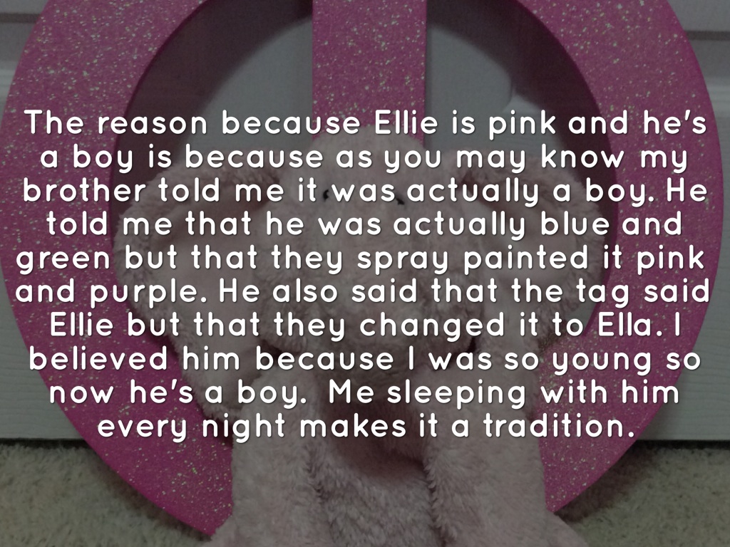 The reason because Ellie is pink and he's a boy is because as you may know my brother told me it was actually a boy. He told me that he was actually blue and green but that they spray painted it pink and purple. He also said that the tag said Ellie but that they changed it to Ella. I believed him because I was so young so now he's a boy. Me sleeping with him every night makes it a tradition.