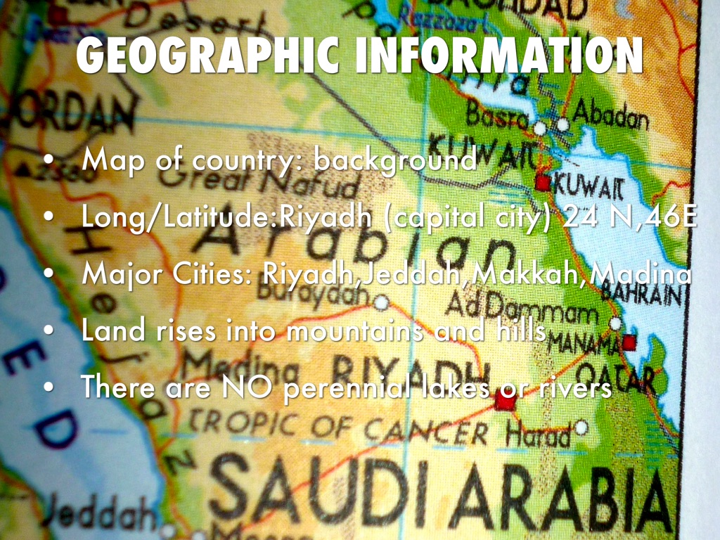Long/Latitude:Riyadh (capital city) 24 N,46E