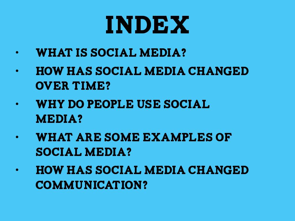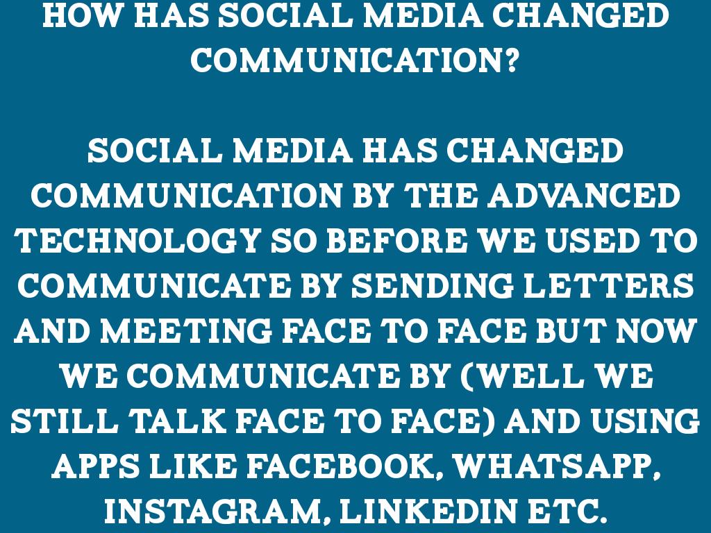 Social media has changed communication by the advanced technology so before we used to communicate by sending letters and meeting face to face but now we communicate by (well we still talk face to face) and using apps like Facebook, WhatsApp, Instagram, Linkedin etc.
