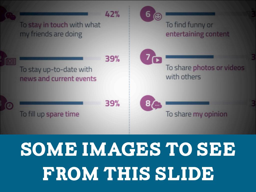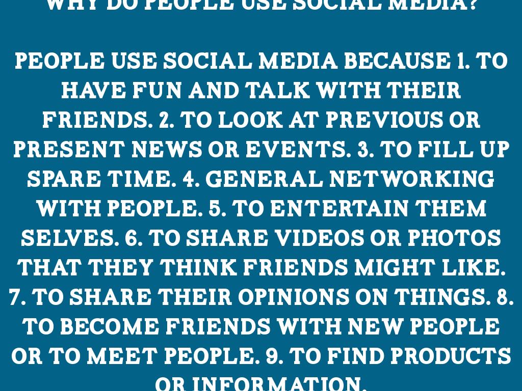 People use social media because 1. to have fun and talk with their friends. 2. To look at previous or present news or events. 3. To fill up spare time. 4. General networking with people. 5. To entertain them selves. 6. To share videos or photos that they think friends might like. 7. To share their opinions on things. 8. To become friends with new people or to meet people. 9. To find products or information.