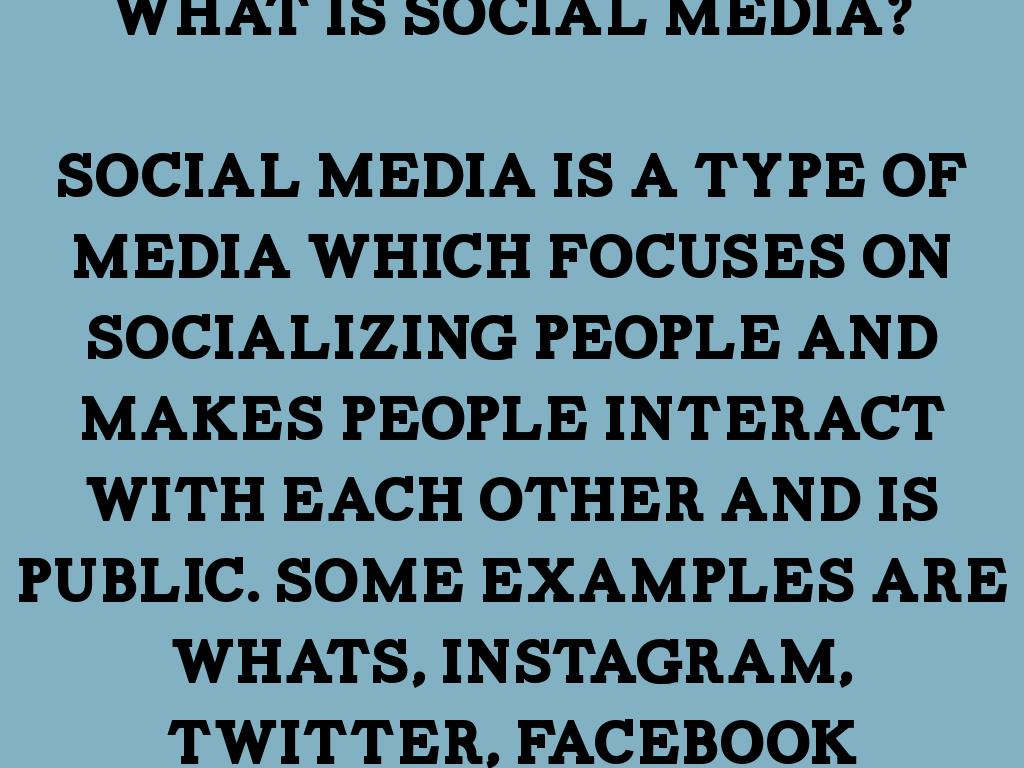 Social media is a type of media which focuses on socializing people and makes people interact with each other and is public. Some examples are Whats, Instagram, Twitter, Facebook