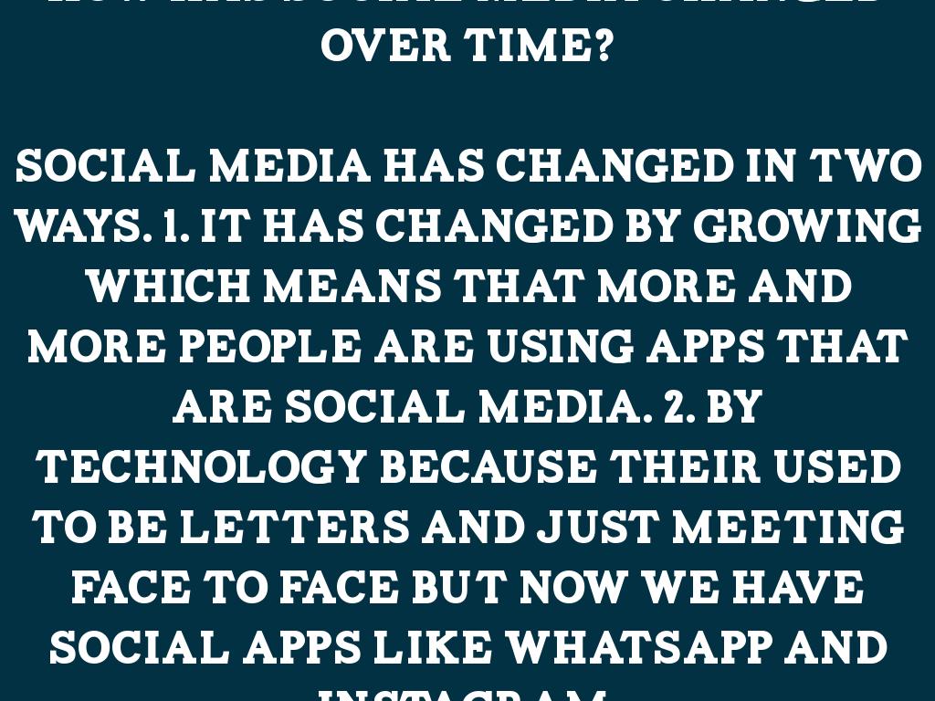 Social media has changed in two ways. 1. It has changed by growing which means that more and more people are using apps that are social media. 2. By technology because their used to be letters and just meeting face to face but now we have social apps like WhatsApp and Instagram.