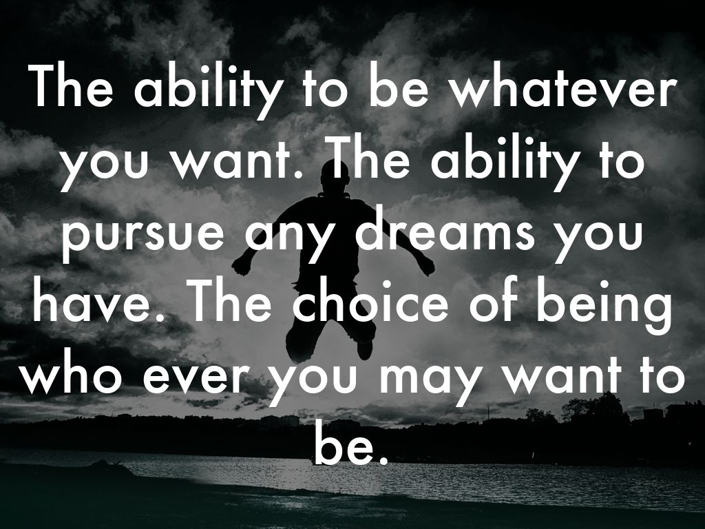 The ability to be whatever you want. The ability to pursue any dreams you have. The choice of being who ever you may want to be.
