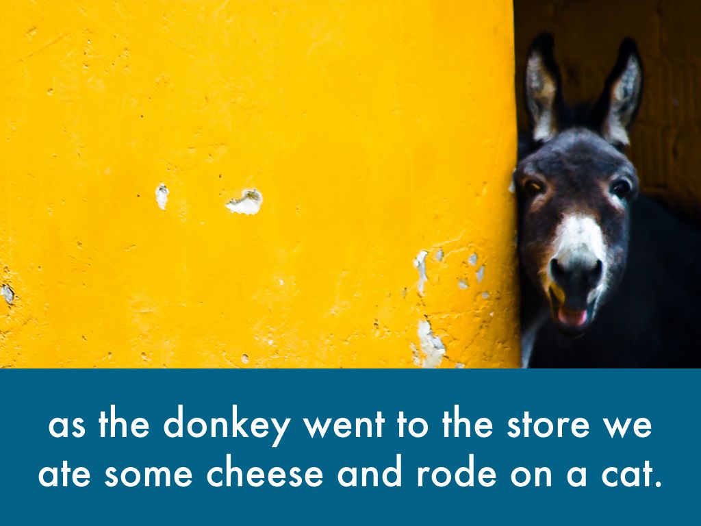 as the donkey went to the store we ate some cheese and rode on a cat.