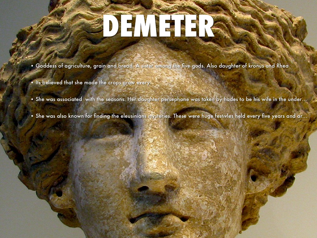 She was associated with the seasons. Her daughter persephone was taken by hades to be his wife in the underworld. Demeter got so mad and laid a curse on the world that caused plants to whither and die , then land became dry. Zues was concerned and tried get her daughter back. But because persephone Had eaten In the Underworld, Hades had A claim on her ,she would have to go back to the underworld four months a year. When demters daughter would be in the underworld she would be depressed and would cause winter but when persephone returned, spring came.
